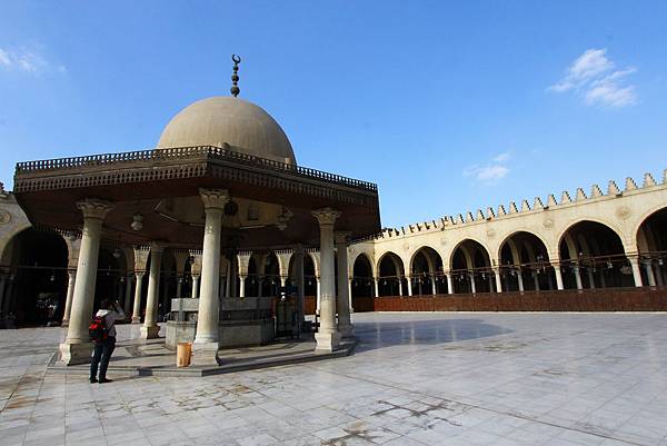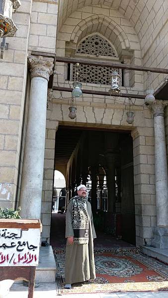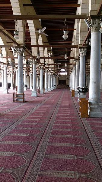 來到了第一個景點, 阿慕爾清真寺, 埃及經歷阿拉伯時期後, 大部分的居民都是信仰伊斯蘭教, 所以其實路上會看到許多的清真寺, 至於為什麼會挑這座清真寺參觀呢? 那是因為這是埃及第一座的清真寺, 有其代表性的意義, 這座清真寺原本只是個小區域, 隨著傳教的發展, 信徒越來越多才慢慢擴建成現在的模式, 裡面很安靜不能喧嘩, 女生也跟其他清真寺一樣會給斗篷在裡面參觀