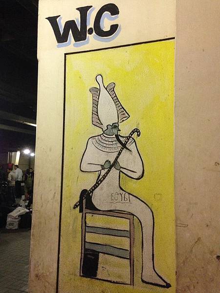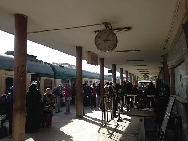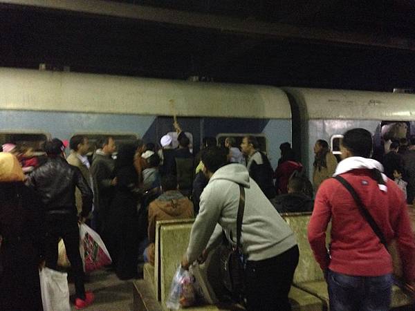 參觀完清真寺也差不多晚上了,一行人準備前往吉薩火車站準備搭夜車前往阿斯旺,整個搭乘時間大概13個小時 (沒誤點的狀況),差不多就是讓你睡飽調時差,當然埃及的火車站也是相當有古埃及特色,車站裡人很多很多,所以還是要小心一點隨身物品, 等車途中看到前一班車, 一群人瘋狂的往前擠往前擠, 搶著上車,大概五分鐘時間整台車塞滿滿滿的人,導遊有解釋這種火車是免費的,所以很多人會搶著搭